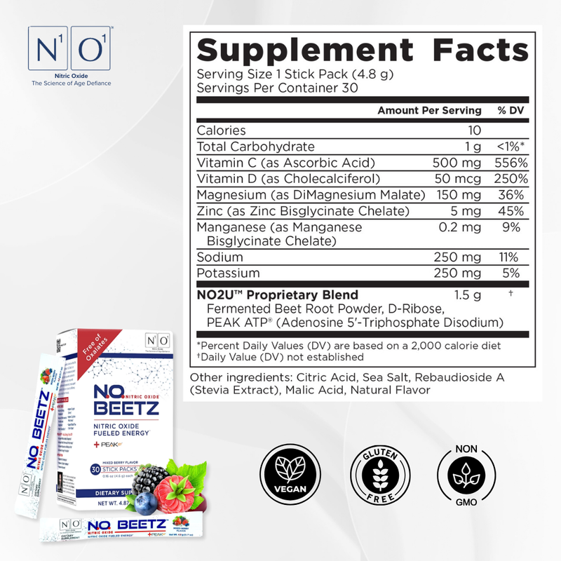 Looking for a natural way to enhance your health and vitality? N.O. Beetz is a unique, plant-based nitric oxide supplement crafted to restore your body’s nitric oxide levels, supporting better circulation, energy, and overall performance. Powered by nutrient-rich fermented beetroot powder, patented PEAK ATP®, and backed by Nobel Prize-winning science, N.O. Beetz delivers noticeable benefits for your body and mind.
